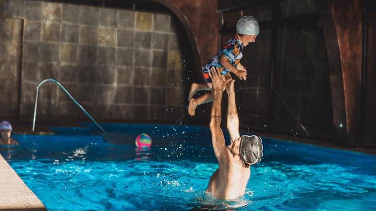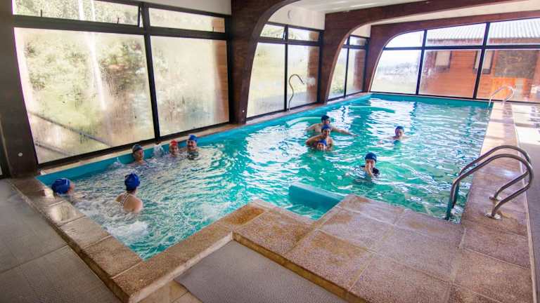 Das Ferienhaus verfügt über einen beheizten Innenpool, der ganzjährig genutzt werden kann. Gäste haben die Möglichkeit, sich auf der Terrasse zu entspannen und die Poolansicht zu geniessen.