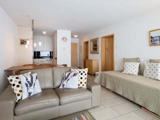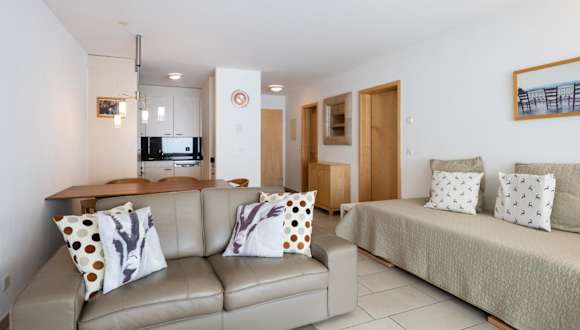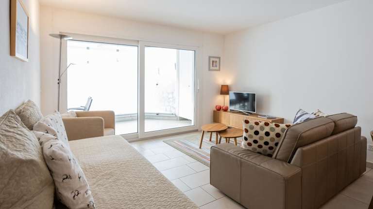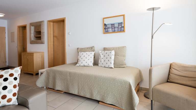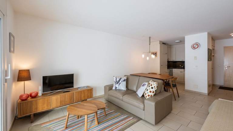 Die Ferienwohnung im Erdgeschoss bietet 1 Schlafzimmer, eine gut ausgestattete Küche mit Kühlschrank und Geschirrspüler, ein Wohnzimmer sowie einen Flachbild-TV. Handtücher und Bettwäsche werden zur Verfügung gestellt.