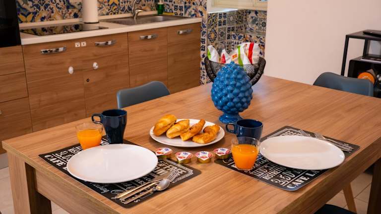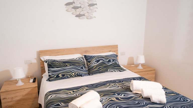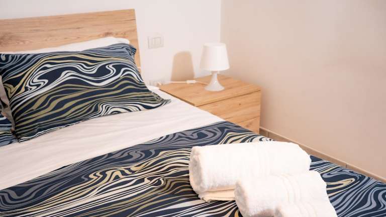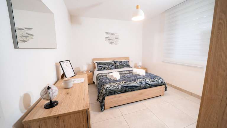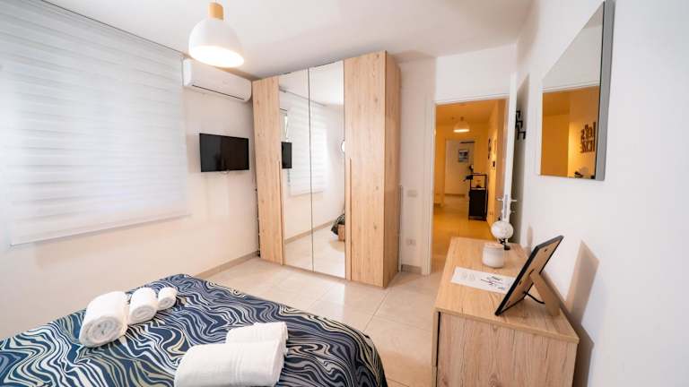 Die Ferienwohnung besteht aus zwei Schlafzimmern und einem Badezimmer, ausgestattet mit Bidet, Dusche und kostenlosen Pflegeprodukten.