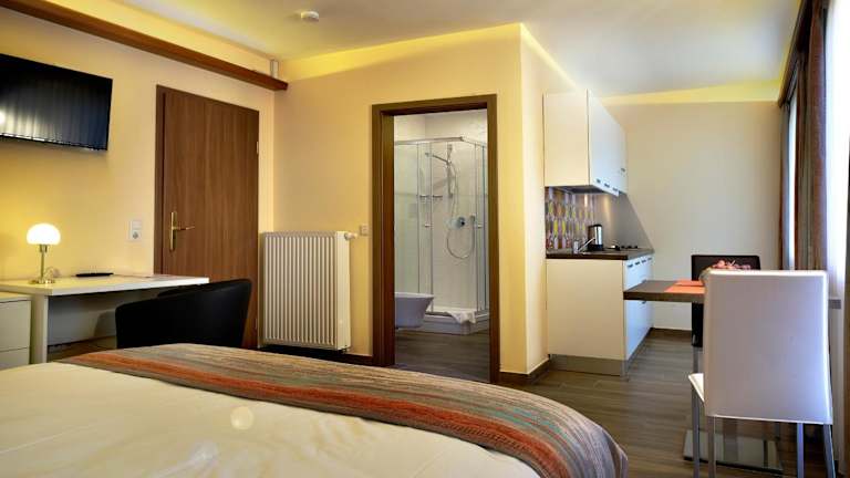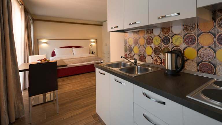 Jede Wohneinheit ist mit einem Esstisch ausgestattet und verfügt über einen Flachbild-TV. Das eigene Badezimmer beinhaltet eine Badewanne oder Dusche und kostenlose Pflegeprodukte. Die Zimmer sind klimatisiert und bieten die Bequemlichkeit einer voll ausgestatteten Küchenzeile.