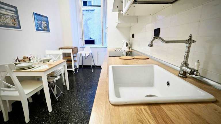Die Ferienwohnung besteht aus zwei Schlafzimmern, einem Wohnzimmer und einer voll ausgestatteten Küche, die über einen Kühlschrank, eine Kaffeemaschine sowie ein Badezimmer mit Bidet und Dusche verfügt. Handtücher und Bettwäsche werden bereitgestellt. Es gibt die Möglichkeit, frühen Check-in oder späten Check-in gegen Aufpreis zu nutzen.