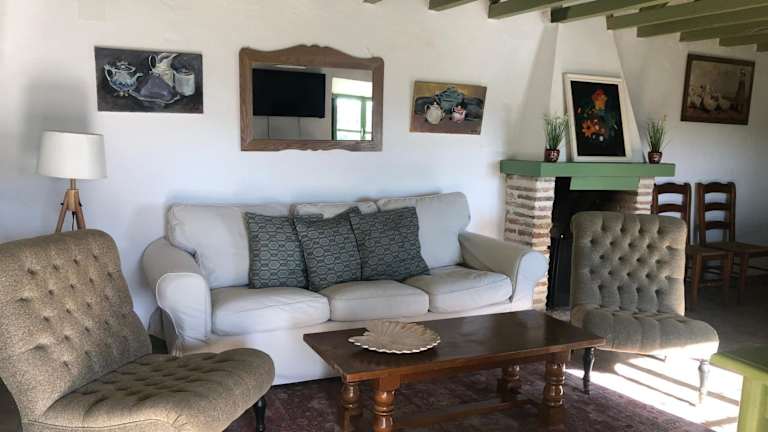 Das Landhaus bietet Platz für bis zu drei Schlafzimmer und ein Wohnzimmer mit TV. Die gut ausgestattete Küche enthält einen Kühlschrank und eine Mikrowelle. Ein Badezimmer mit Dusche sowie eine Veranda/Patiobereich mit Poolblick sind vorhanden. Handtücher und Bettwäsche werden bereitgestellt.
