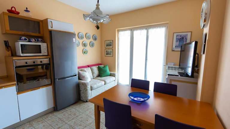 Die Ferienwohnung besteht aus 2 klimatisierten Schlafzimmern und einem Badezimmer, das mit einem Bidet, einer Dusche und einem Haartrockner ausgestattet ist. Ein Sitzbereich und eine voll ausgestattete Küche mit Kühlschrank, Ofen und Mikrowelle runden die Ausstattung ab.