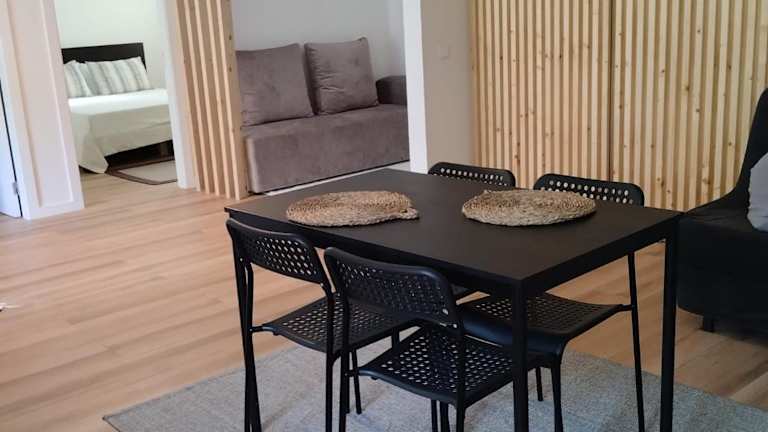 Die Ferienwohnung umfasst 2 Schlafzimmer, ein Wohnzimmer sowie eine voll ausgestattete Küche mit Kühlschrank und Kaffeemaschine. Das Badezimmer ist mit einer Dusche und einem Haartrockner ausgestattet. Handtücher und Bettwäsche werden bereitgestellt.