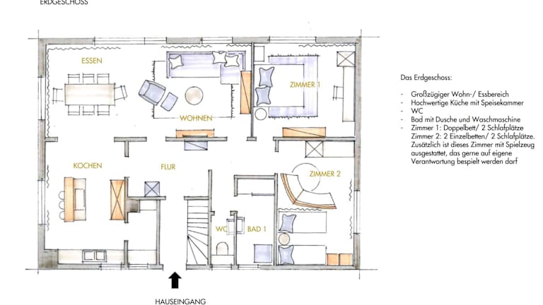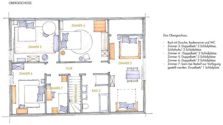 Das Ferienhaus bietet Platz in 6 Schlafzimmern sowie 2 Badezimmer mit Dusche und Badewanne. Eine voll ausgestattete Küche, ein gemütliches Wohnzimmer mit Essbereich und ein DVD-Player sind vorhanden. Handtücher und Bettwäsche werden bereitgestellt.