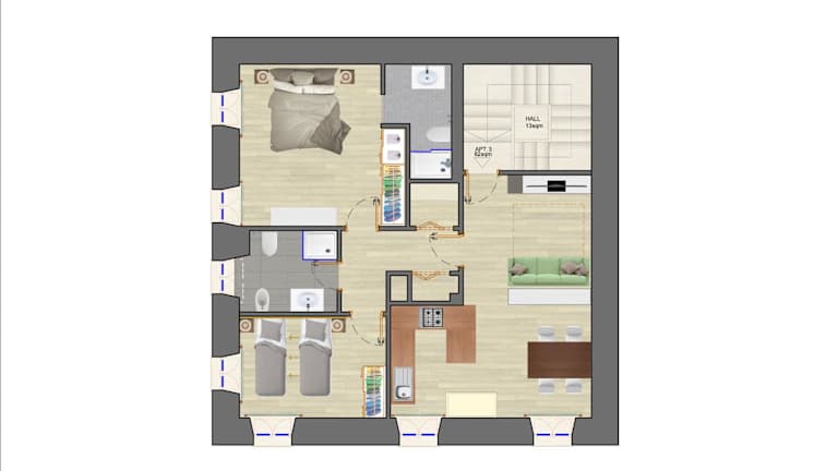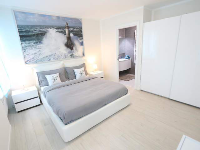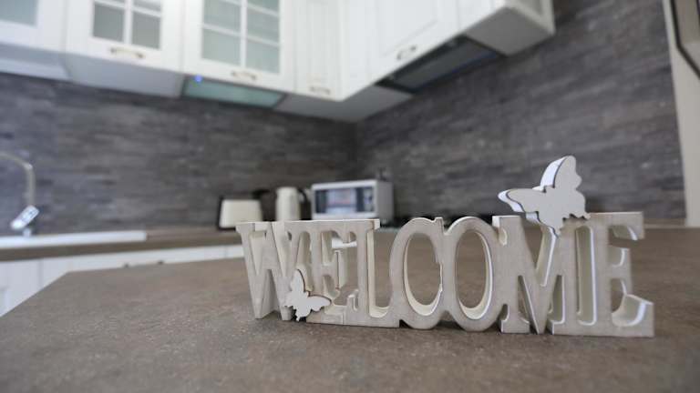 Die Ferienwohnung verfügt über eine voll ausgestattete Küche mit Kühlschrank, Geschirrspüler und Ofen. Sie bietet ein Wohnzimmer mit Sitz- und Essbereich, 2 Schlafzimmer sowie 2 Badezimmer, die jeweils mit Bidet und Dusche ausgestattet sind. Handtücher und Bettwäsche werden bereitgestellt.