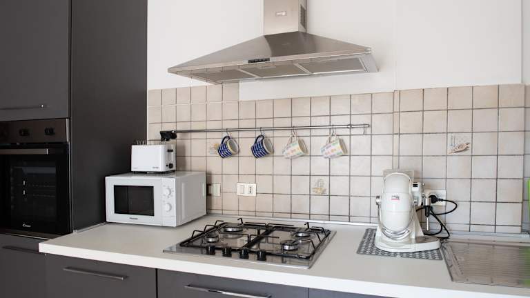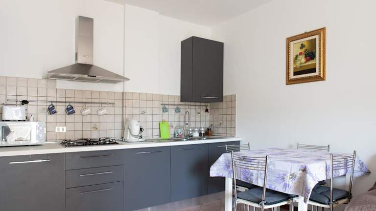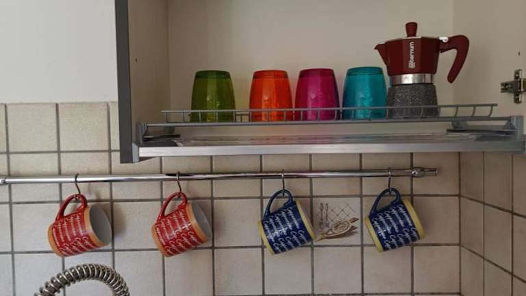 Die Ferienwohnung ist mit einer voll ausgestatteten Küche versehen, die Möglichkeiten zur Selbstverpflegung bietet. Ein Kühlschrank und eine Kaffeemaschine sind vorhanden. Keine Verpflegungsangebote erwähnt.