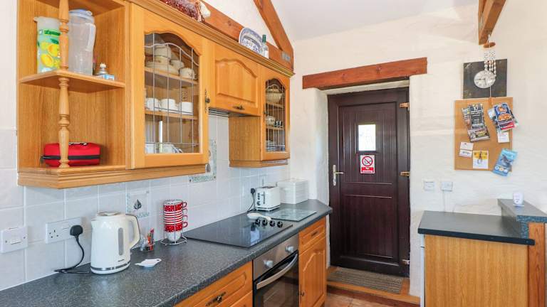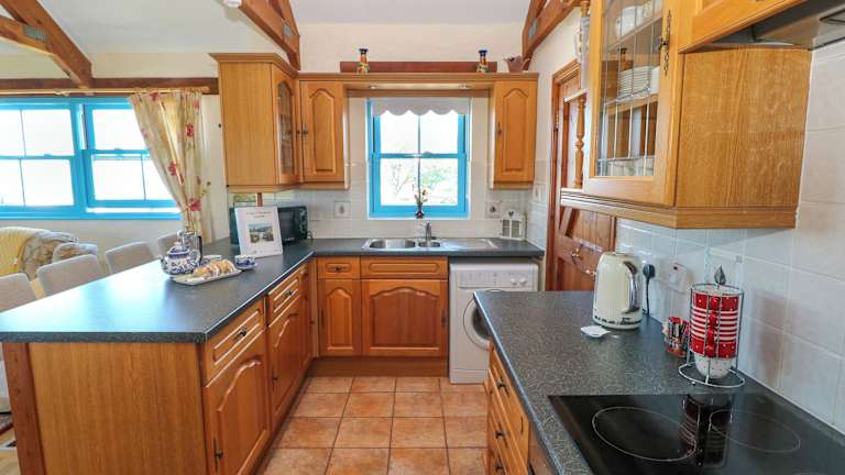 Das Ferienhaus ist ausgestattet mit einem TV sowie einer gut ausgestatteten Küche, welche einen Kühlschrank, einen Geschirrspüler, einen Ofen und einen Haartrockner umfasst.