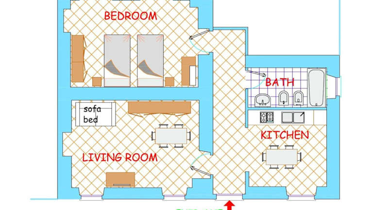 Die Ferienwohnung besteht aus einem Schlafzimmer, einem Wohnzimmer und einer voll ausgestatteten Küche mit Kühlschrank. Das Badezimmer ist mit einem Bidet und einem Haartrockner ausgestattet. Handtücher und Bettwäsche werden bereitgestellt.