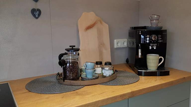 Die Unterkunft verfügt über eine voll ausgestattete Küche mit Kühlschrank, Geschirrspüler, Ofen, Kaffeemaschine und Wasserkocher, was eine unabhängige Selbstverpflegung ermöglicht.