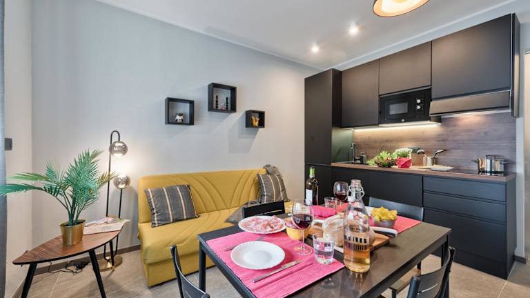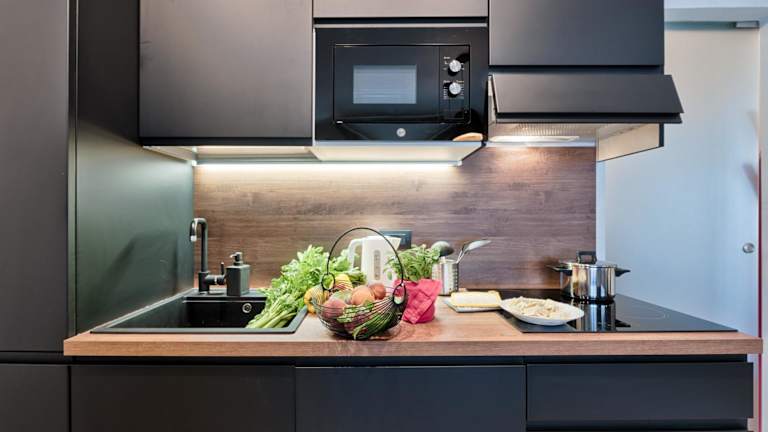 Die Ferienwohnung ist mit einer voll ausgestatteten Küche versehen, die einen Kühlschrank, einen Geschirrspüler, einen Ofen sowie eine Kaffeemaschine und einen Wasserkocher umfasst.