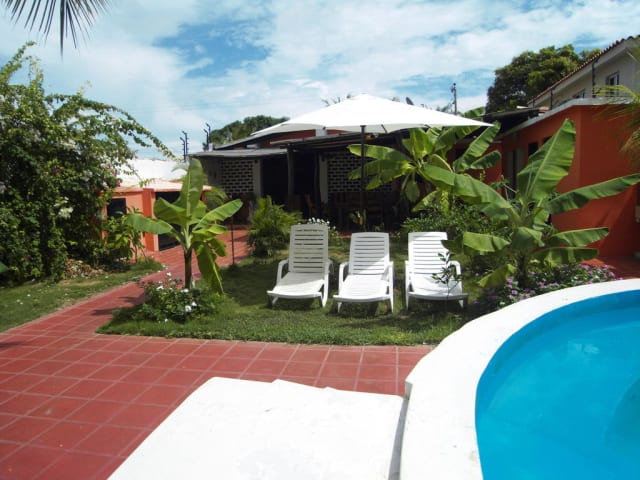 Willkommen im Ferienhaus Casa Rosa Wir begruessen sie alle sehr herzlich und bedanken uns fuer Ihr Interesse an unser Ferienhaus. Unser Ferienhaus ist 500 Meter entfernt von den schönsten Strand Isla de Margaritas, umgeben von einen idyllischen Tropengarten mit einen kreisrunden Pool mit Dusche und WC. Eine ca. 20 m² großen Terasse, ein Grill befindet sich gleich daneben der abends zum Fisch grillen einlädt. Die Anlage verfügt über 430 m² Wohnfläche mit 8 Zimmern, jedes Gästezimmer ist mit Kühlschrank, Safe, Fernseher, Satellitenanschluss für internationales und deutsches Fernsehen (98 Programme), Klimaanlage, Bad mit Warmwasser ausgestattet Auf dem Grundstück unseres Ferienhauses bieten wir unseren Gästen an, Wi-Fi Internetverbindung kostenlos zu nutzen. (Nemen Sie Ihren Laptop mit) Ein 30 m² Wohnzimmer mit komfortabler Ledersitzecke und einen großen Esstisch mit 6 Sitzplätze bietet unseren Urlaubern zusätzlich noch genügend Raum um für sich alleine zu sein. Eine offene Küche schließt sich dem Wohnzimmer an, mit großer Einbauchküche, mit allem, was Sie zur Selbstversorgung benötigen, ein Gefriertruhe, Microwelle, Toaster, Kaffeemaschine, Mixer. Außerdem hat das Ferienhaus eine eigene Wäscherei. Unser Ferienhaus Casa Rosa liegt im Norden der Insel, ist 25 km von der Shoppingmeile Porlamar entfernt. In weniger als 10 Minuten erreichen Sie die umliegenden Strände, wie Playa Parguito und Playa Manzanillo z.B. mit dem Bus oder Taxi. Einkaufscenter, Bäckerei, Bank, Apotheken, Souvenirshops, Cafe und Restaurants verschiedener Nationalitäten sowie Autovermietungen befinden sich in unmittelbarer Nähe und sind gut zu Fuß zu erreichen. (Parque Aqua) Aquapark mit seinen riesigen Wasserrutschen ist nur 3 km entfernt. Wir bieten unseren Gästen an sie 1 X pro Woche zu einen großen Supermarkt zu fahren um einzukaufen und wir machen auch eine Shoppingtour um günstige Bekleidung zu kaufen. Außerdem empfehlen wir Ihnen die besten Restaurants und zeigen Ihnen die verschiedenen Strände. Abends lassen Sie sich vom typischen Nightlife in den Strandbars mit Lifemusik verwöhnen oder genießen Discotheken-, Nachtbar- und Casinotripps durch Porlamar.