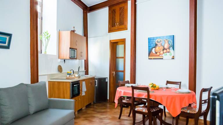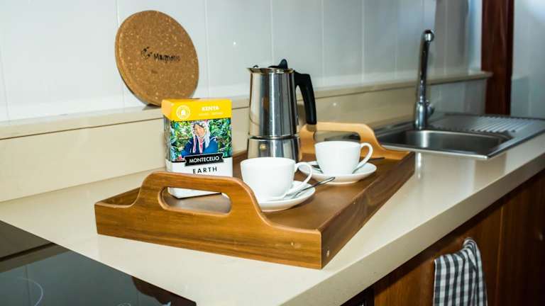 Die Ferienwohnung besteht aus einem Schlafzimmer, einem Wohnzimmer und einer voll ausgestatteten Küche mit Kühlschrank und Kaffeemaschine. Ein Badezimmer mit Dusche und kostenlosen Pflegeprodukten ist ebenfalls vorhanden. Bettwäsche und Handtücher werden bereitgestellt.