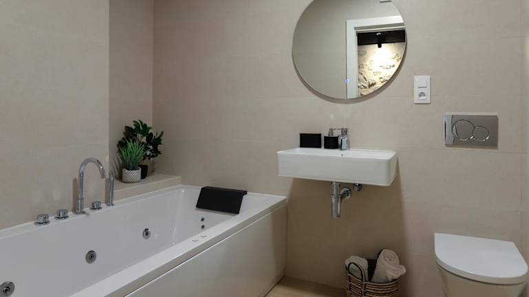 Die Ferienwohnung besteht aus 2 Schlafzimmern, einem Wohnzimmer mit Flachbild-TV, einer gut ausgestatteten Küche sowie 2 Badezimmern mit Dusche und Whirlpool. Die Unterkunft verfügt zudem über einen Balkon mit Gartenblick. Handtücher und Bettwäsche werden gestellt.