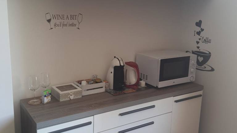 Die Ferienwohnung umfasst 1 Schlafzimmer, ein Wohnzimmer und eine voll ausgestattete Küche mit Kühlschrank und Kaffeemaschine. Ein Badezimmer mit Bidet und Dusche ist ebenfalls vorhanden. Handtücher und Bettwäsche werden bereitgestellt.
