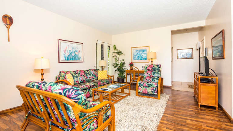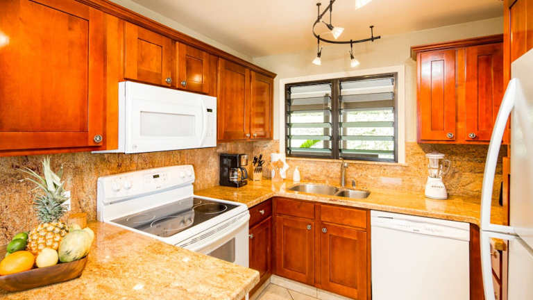 Die Apartments im Castle Kaha Lani Resort sind mit vollständig ausgestatteten Küchen, einer Kaffeemaschine, Sitzecken, Kabel-TV und Deckenventilatoren ausgestattet.