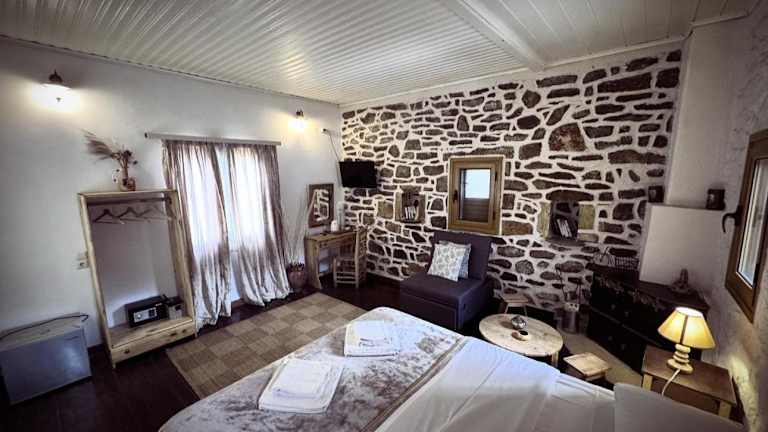 Die Unterkünfte im Castle Rizaraki sind klimatisiert und umfassen Schallisolierte Zimmer, die mit dunklen Holzbetten, traditionellen Möbeln und komfortabler Ausstattung eingerichtet sind. Allergikerfreundliche Zimmer sind ebenfalls verfügbar.