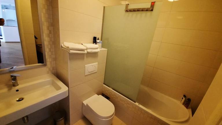 Die Ferienwohnung besteht aus zwei Schlafzimmern und einem Wohnzimmer. Zur Ausstattung gehören eine Klimaanlage, ein Flachbild-TV und ein Balkon. Schallisolierte Zimmer sind vorhanden. Zudem wird tägliche Reinigung angeboten (gegen zusätzliche Gebühren).