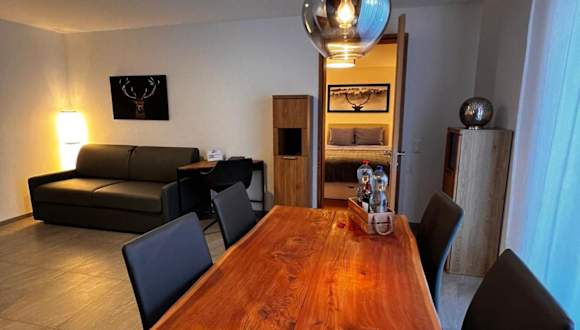 Die Ferienwohnung umfasst ein Schlafzimmer, ein Wohnzimmer sowie eine gut ausgestattete Küche mit Kühlschrank und Geschirrspüler. Handtücher und Bettwäsche werden zur Verfügung gestellt. Eine Terrasse lädt zum Entspannen im Freien ein.