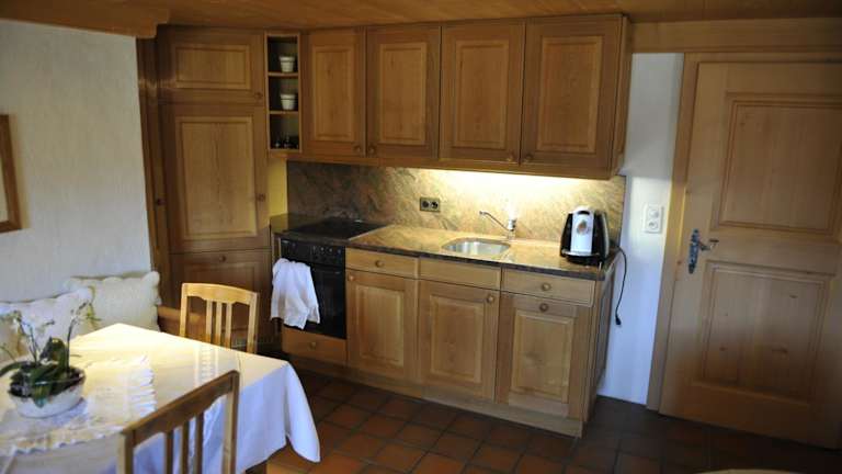 Die Ferienwohnung verfügt über 2 Schlafzimmer, ein Badezimmer, Bettwäsche, Handtücher und einen Flachbild-TV mit Kabelkanälen. Die voll ausgestattete Küche ermöglicht eine Selbstversorgung, und die Terrasse bietet einen herrlichen Bergblick.