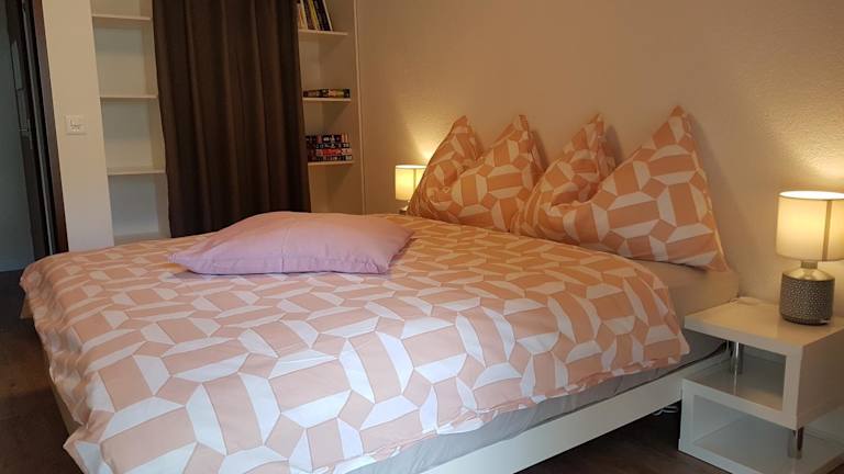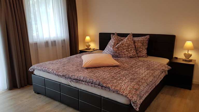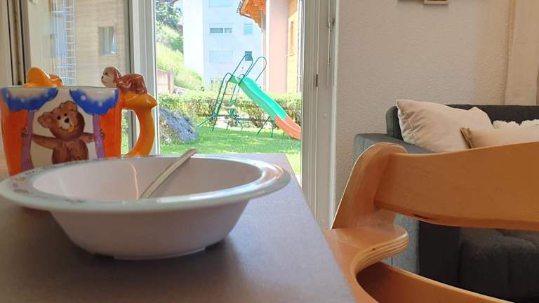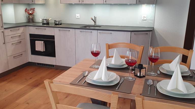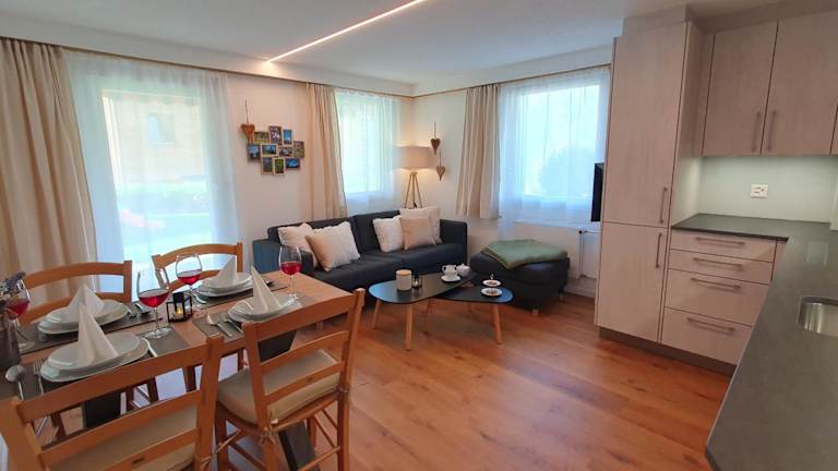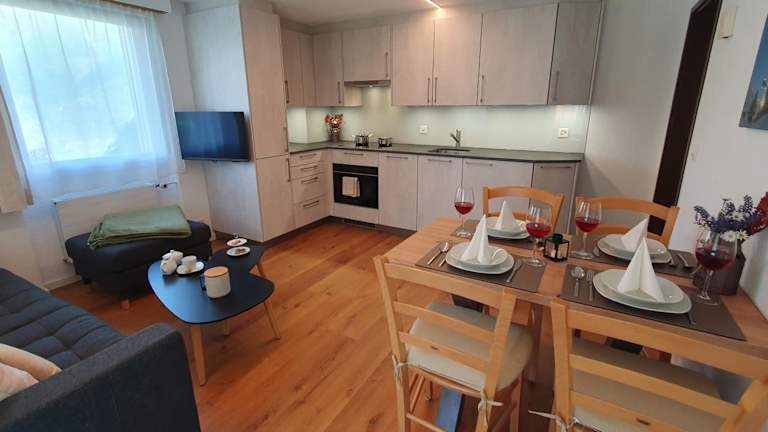 Die Ferienwohnung ist modern und heimelig eingerichtet mit 2 Schlafzimmern und 1 Badezimmer. Zur Ausstattung gehören Bettwäsche, Handtücher, ein Flachbild-TV mit Kabelkanälen sowie ein Essbereich. Die voll ausgestattete Küche bietet alles Notwendige für die Zubereitung von Mahlzeiten. Die Terrasse mit Blick auf die Berge rundet das Angebot ab.