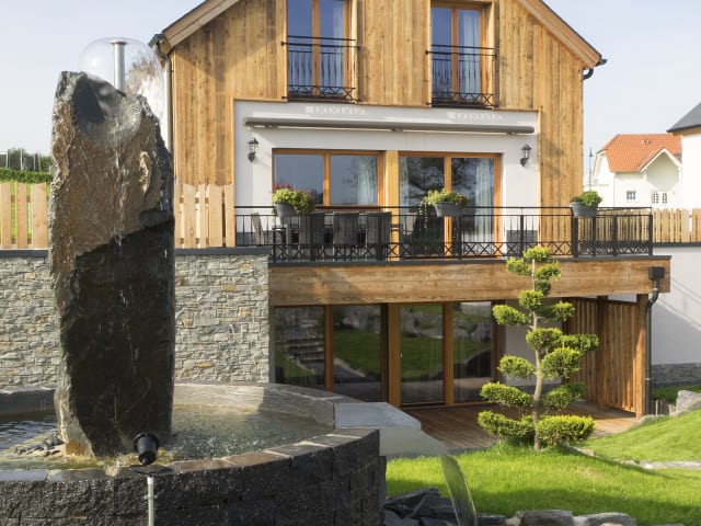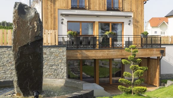 Exklusive Wellnesschalets Am Südzipfel des Naturparks Our in Luxemburg sind im Sommer 2017 sechs Wellnesschalets für jeweils bis zu 8 Personen entstanden. Sie erfüllen höchste Ansprüche hinsichtlich Lage, Behaglichkeit, Komfort, Ausstattung und Service. Entsprechend sind auch die parkartige Anlage mit Teich, einer Massagehütte, einer Fahrradhütte und den Chalets konzipiert. Die Chalets sind sich baulich gleich, lediglich der Grundriss ist bei jedem zweiten Haus gespiegelt. Auch die Ausstattung ist bei allen gleich hochwertig. Dennoch sind sie in ihrer thematischen Ausrichtung ganz unterschiedlich. Jedes hat seinen eigenen Charakter, angelehnt an jenen der namensgebenden luxemburgischen Flüsse. Dies soll ein Sinnbild dafür sein, dass Sie Ihren Urlaub in unserer schönen Heimat ganz nach Lust und Laune individuell gestalten können. Die Möglichkeiten sind nahezu unerschöpflich. Die Chalets sind sehr luxuriös ausgestattet. Auch an Tagen, an denen das Wetter eher zum Daheimbleiben auffordert, soll es Ihnen an nichts fehlen. Wer möchte, nimmt nach der Sauna ein Bad im Außenwhirlpool, relaxt anschließend auf einer Wellnessliege oder gönnt sich eine Massage in der extra dafür vorgesehenen Massagehütte. Und wenn Sie nun so richtig Appetit bekommen haben, bieten Ihnen die gut ausgestattete Küche sowie die Bar mit Weinkühlschrank einen guten Platz zum Ausprobieren regionaler Produkte und Spezialitäten. Der Standort ist ideal: gut zu erreichen, ungestörte Ortsrand- und Sackgassenlage, unverbaubare Sicht über die sanften Hügel des romantischen Ourtals. Es ist ein idealer Ausgangspunkt für Wander-, Rad- und Mountainbiketouren. Zugleich offeriert das nahe Vianden ein vielfältiges kulinarisches, kulturelles und touristisches Angebot.