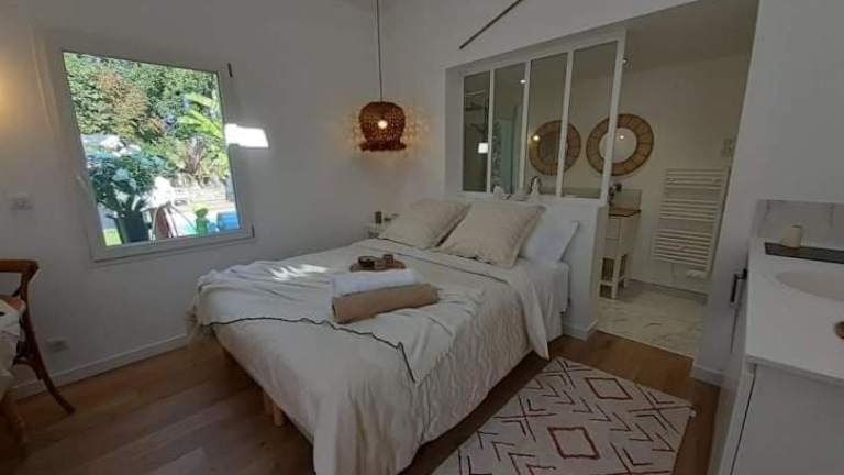 Das Chambre Cosy Chic in Challans ist eine ideale Unterkunft für einen entspannten Aufenthalt. Genießen Sie den saisonalen Außenpool, den Garten und die Terrasse sowie kostenfreies WLAN und den atemberaubenden Blick auf den Pool. Das Zimmer verfügt über einen Flachbild-TV und eine gut ausgestattete Küchenzeile. Kostenlose Privatparkplätze und Fahrradverleih stehen ebenfalls zur Verfügung. Die Unterkunft liegt in der Nähe von Sehenswürdigkeiten wie dem Casino von Saint Jean de Monts und dem Bahnhof Pornic. Der Flughafen Nantes Atlantique ist ebenfalls gut erreichbar.