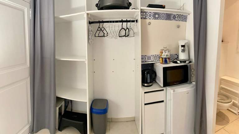 Das Privatzimmer ist klimatisiert und verfügt über einen Essbereich sowie eine Küchenzeile mit Kühlschrank. Es bietet einen Satelliten Flachbild-TV. Handtücher und Bettwäsche werden bereitgestellt.