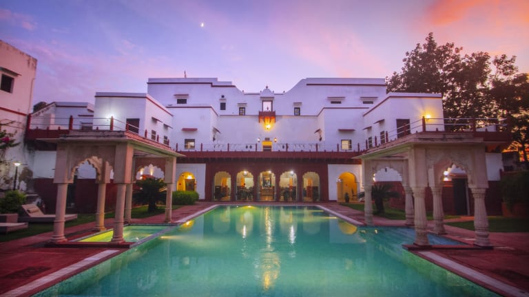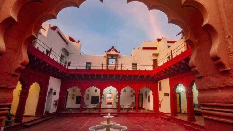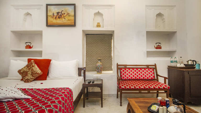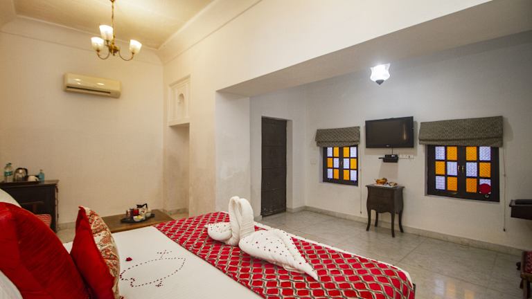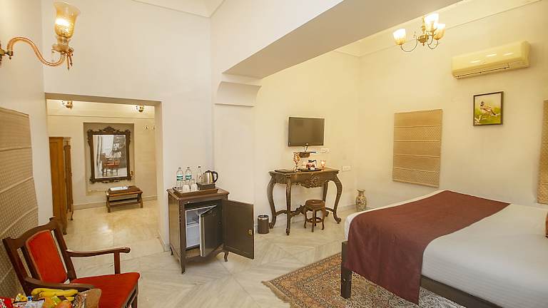 Das Chandra Mahal Haveli in Bharatpur ist eine denkmalgeschützte Unterkunft, die mit ihrem Außenpool und dem 24-Stunden-Rezeptionsservice für Komfort und Entspannung sorgt. Die klimatisierten Zimmer sind modern ausgestattet und verfügen über Annehmlichkeiten wie Flachbild-Sat-TV, Sitzecke und Balkon. Das Hotel bietet zudem einen schönen Garten, eine Terrasse und praktische Einrichtungen wie einen Tourenschalter und einen Parkplatz. Das hauseigene Restaurant Peharsi Andaaz verwöhnt Sie mit einer Vielfalt an indischen, regionalen und kontinentalen Gerichten. Genießen Sie Ihre Mahlzeiten auch ganz bequem auf Ihrem Zimmer mit dem Zimmerservice.