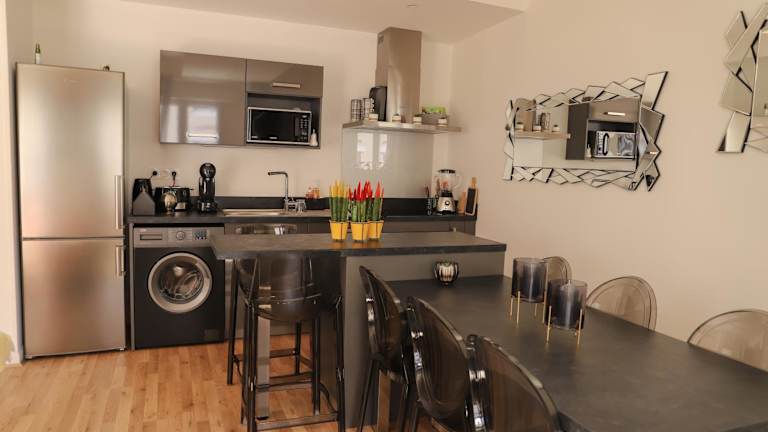 Die Ferienwohnung verfügt über 2 Schlafzimmer, eine Küche ausgestattet mit Kühlschrank und Geschirrspüler, sowie ein Badezimmer mit Dusche und kostenlosen Pflegeprodukten. Zu den Annehmlichkeiten gehören auch eine Waschmaschine, Handtücher und Bettwäsche, die bereitgestellt werden.