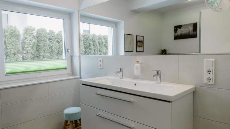 Die Ferienwohnung verfügt über 2 Schlafzimmer, ein Wohnzimmer, eine gut ausgestattete Küche mit Kühlschrank und Geschirrspüler, sowie 2 Badezimmer mit Dusche. Die Ausstattung umfasst auch einen Flachbild-TV und es sind Handtücher und Bettwäsche vorhanden.