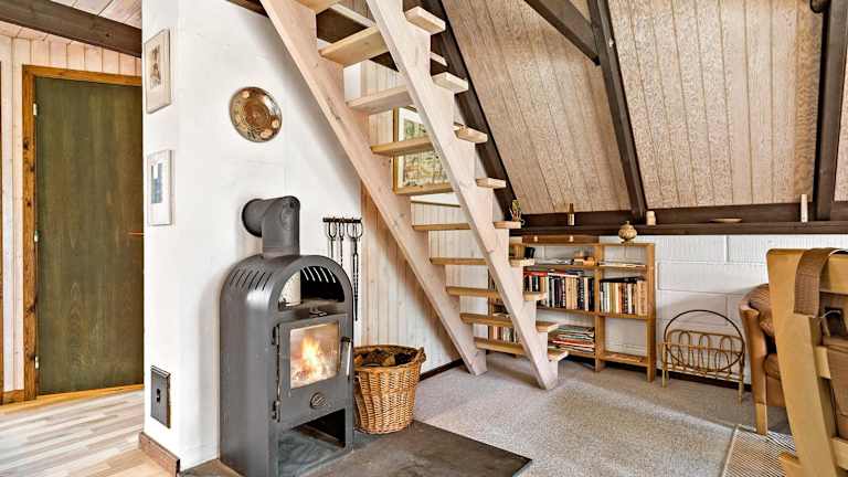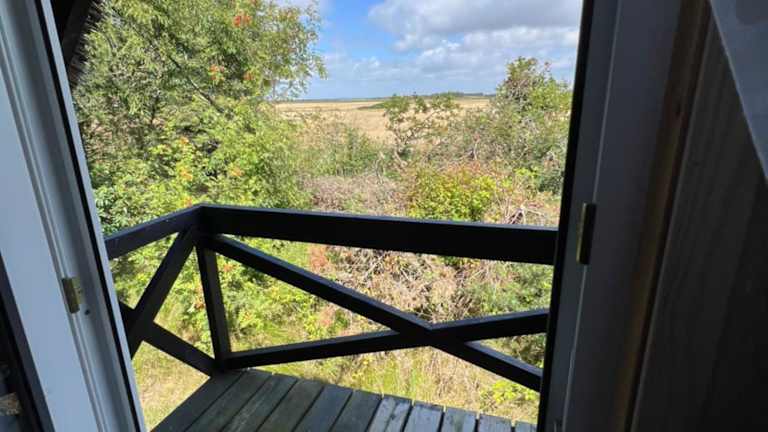 Das Charmerende sommerhus - natur, hygge og ro ist ein heimeliges Ferienhaus mit einem Balkon und einer Terrasse. Die Unterkunft bietet eine entspannte Atmosphäre für die Gäste.