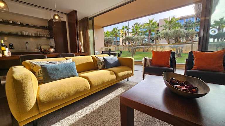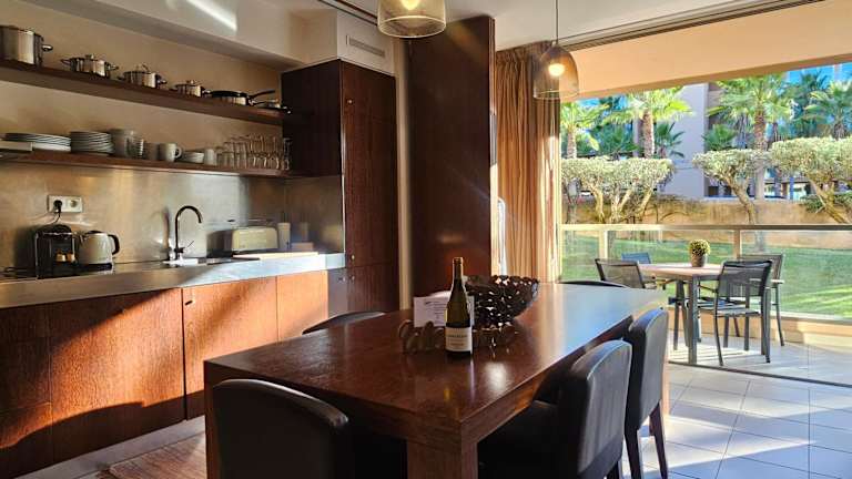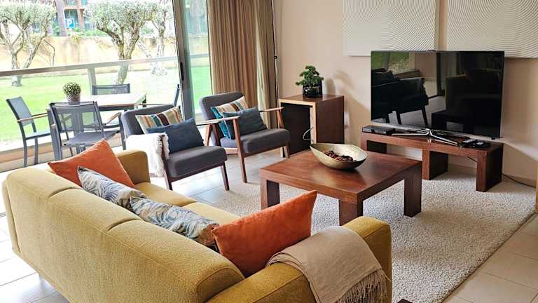 Die Ferienwohnung ist klimatisiert und beinhaltet zwei Schlafzimmer, ein Wohnzimmer sowie eine voll ausgestattete Küchenzeile mit Kühlschrank und Kaffeemaschine. Es stehen zwei Badezimmer mit Bidet und Haartrockner zur Verfügung. Handtücher und Bettwäsche werden bereitgestellt.