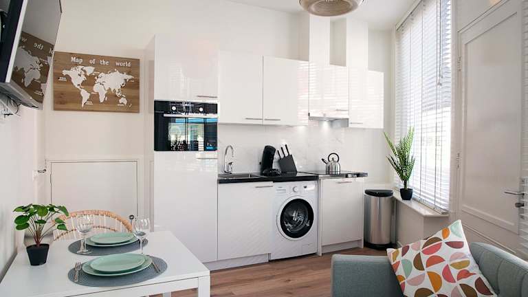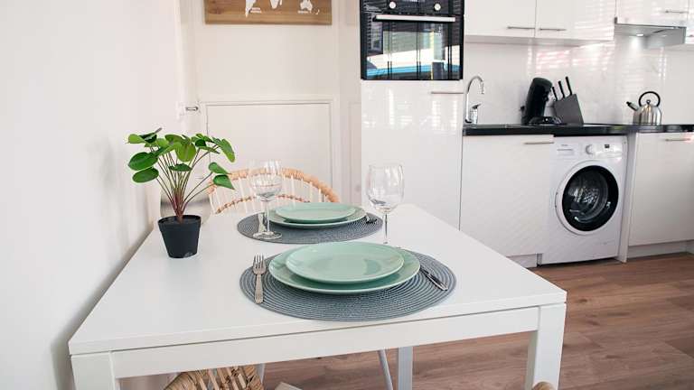 Die Unterkunft verfügt über eine gut ausgestattete Küche mit Kühlschrank, Geschirrspüler, Ofen, Mikrowelle, Herdplatte, Kaffeemaschine und Wasserkocher, sodass Gäste ihre eigenen Mahlzeiten zubereiten können. Es sind keine Informationen zu gastronomischen Angeboten vorhanden.