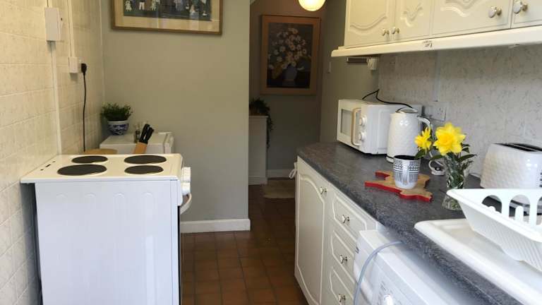 Das Ferienhaus verfügt über ein Schlafzimmer und ein Badezimmer. Zur Ausstattung gehören Bettwäsche, Handtücher, ein Flachbild-TV, ein Essbereich sowie eine voll ausgestattete Küche. Die Terrasse bietet einen Blick auf den Garten.