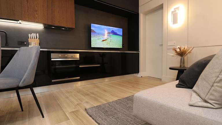 Die Ferienwohnung verfügt über ein Schlafzimmer, ein Wohnzimmer und eine voll ausgestattete Küche mit Kühlschrank und Kaffeemaschine. Ein Badezimmer mit Bidet und Dusche ist ebenfalls vorhanden. Handtücher und Bettwäsche werden bereitgestellt. Die Ferienwohnung ist klimatisiert.