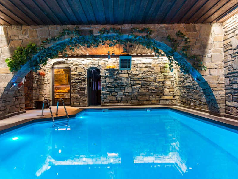 Die Unterkunft ist eine heimelige, holzgebaute Villa, die Ruhe und Erholung bietet. Gästen stehen zahlreiche Annehmlichkeiten zur Verfügung, darunter eine Sauna, ein Türkisches Bad und ein Innenpool mit Wasserfällen und Wasserjets. Der Garten lädt zu entspannenden Spaziergängen ein, und es gibt Grillmöglichkeiten zum gemütlichen Verweilen.