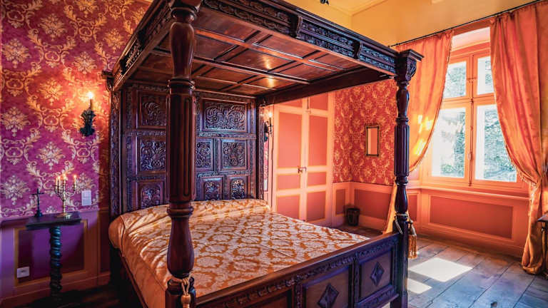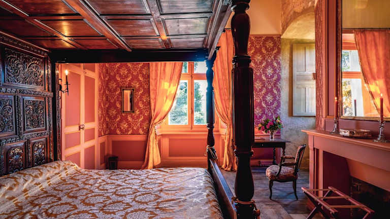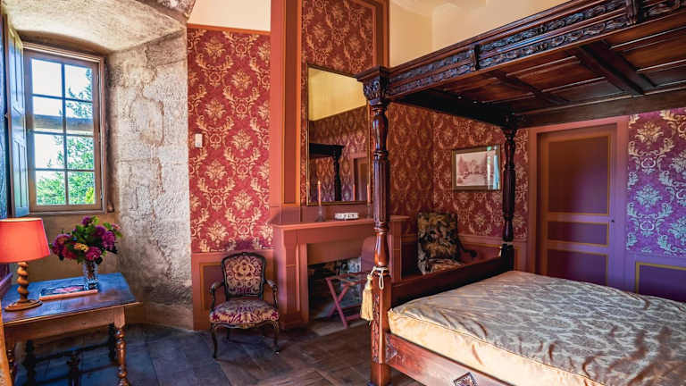 Die Zimmer im Château de La Vigne sind im traditionellen Stil eingerichtet und verfügen über ein gemütliches Himmelbett, einen komfortablen Sitzbereich und ein eigenes Bad mit kostenlosen Pflegeprodukten. Jedes Zimmer ist einladend und bietet eine angenehme Atmosphäre für einen erholsamen Aufenthalt.