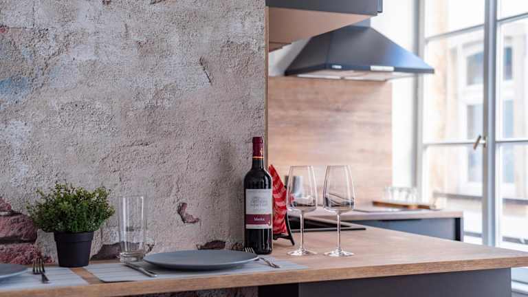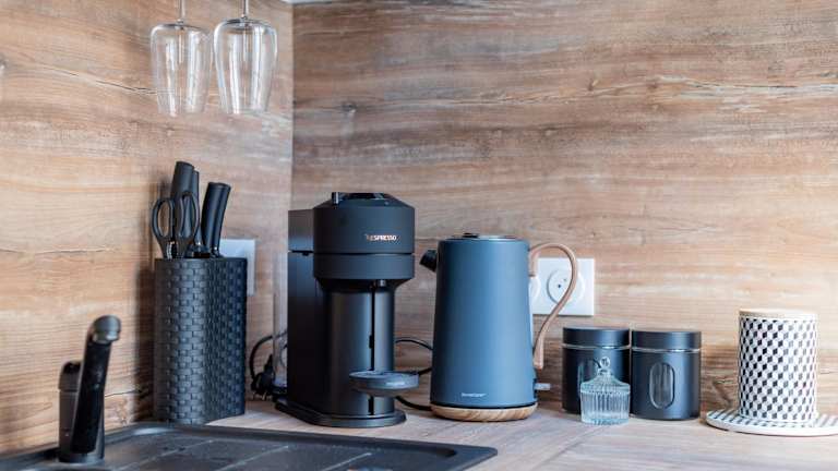 Eine Küche steht in der Ferienwohnung zur Verfügung, ausgestattet mit einem Kühlschrank, einem Ofen, einer Mikrowelle, einer Kaffeemaschine und einem Wasserkocher. Es ist zudem ein Café vor Ort vorhanden, jedoch keine weiteren gastronomischen Angebote erwähnt.