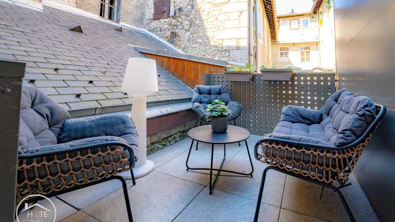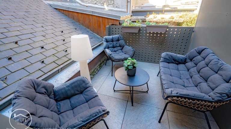 Das L'instant léger - Centre ville bietet Übernachtungsmöglichkeiten mit Zugang zu einem Whirlpool. Die Ferienwohnung überzeugt durch einen Balkon sowie eine Terrasse mit Stadtblick.