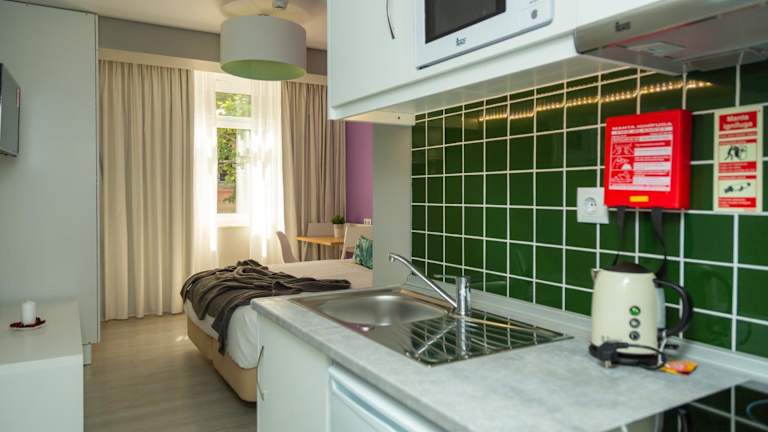 Die Zimmer sind schallisoliert und mit Klimaanlage, Heizung sowie einem Flachbild-Kabel-TV ausgestattet. Sie verfügen über ein eigenes Bad und eine Küche. Bettwäsche, Handtücher und Wäsche werden nach den Richtlinien der örtlichen Behörden gewaschen. Für die Bequemlichkeit der Gäste gibt es einen Sicherheitsalarm, Rauchmelder und Videoüberwachung in den Gemeinschaftsbereichen.
