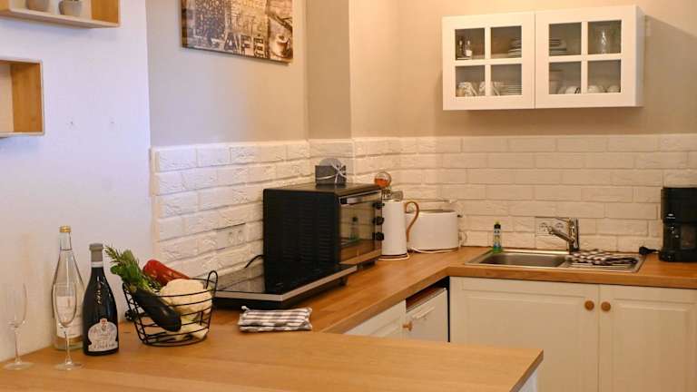 Die Küche der Ferienwohnung ist mit einem Kühlschrank, einem Ofen, einem Toaster, einer Kaffeemaschine sowie einem Wasserkocher ausgestattet. Es sind keine Informationen über weitere Verpflegungsmöglichkeiten vorhanden.