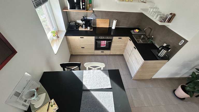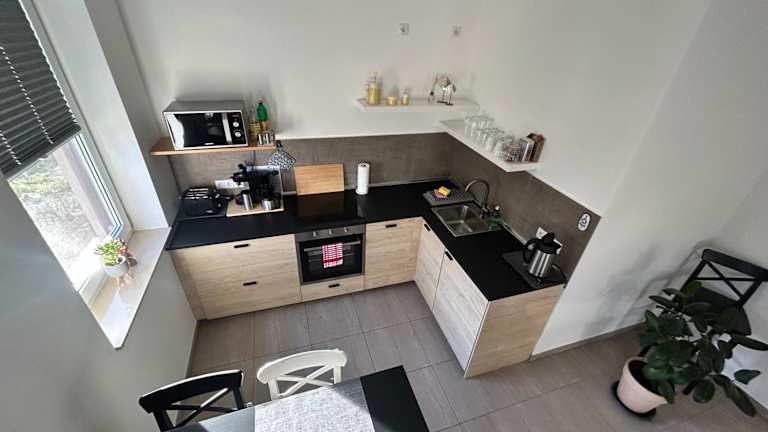 Die Ferienwohnung enthält eine voll ausgestattete Küche mit einem Kühlschrank und einer Kaffeemaschine, jedoch keine spezifischen Informationen zu Verpflegungsmöglichkeiten vorhanden.