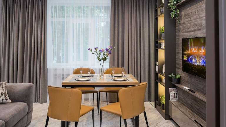 Jedes Apartment ist individuell gestaltet und eingeschlossen in der Ausstattung sind eine Whirlpool-Badewanne, ein Haartrockner und eine voll ausgestattete Küche. Zur weiteren Ausstattung gehören ein Sicherheitsalarm, schallisolierte Zimmer, und die Möglichkeit zur Nutzung von Wifi. Die Reinigung der Apartments erfolgt einmal pro Woche.