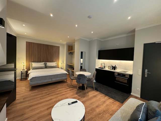 Das City-Studio im Innenhof bietet Übernachtungsmöglichkeiten mit einem Boxspring-Bett und einem einladenden Community-Raum. Die Unterkunft ist ideal für Gäste, die einen heimeligen Rückzugsort suchen.
