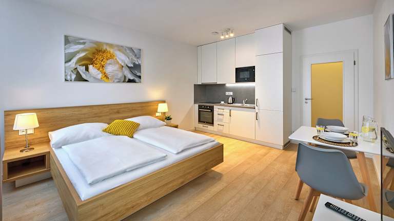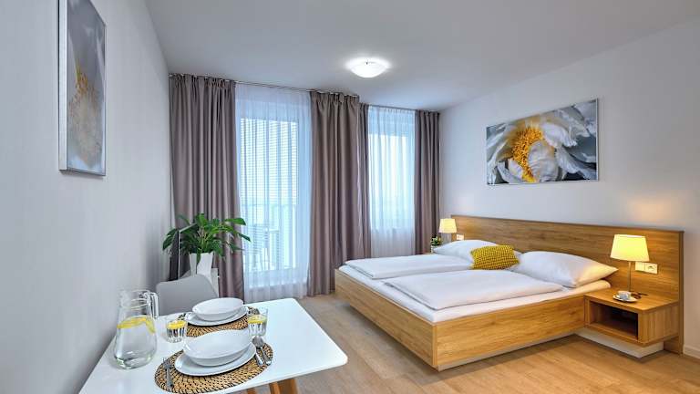 Die Apartments bieten ein behagliches Raumklima dank Heizung und sind mit einem Balkon oder einer Terrasse ausgestattet. Die Unterkünfte verfügen über ein Queensize-Bett, ein Kingsize-Bett oder ein Sofabett. Zustellbetten können angefragt werden. Jedes Apartment bietet eine voll ausgestattete Küche mit Kühlschrank, Mikrowelle, Geschirrspüler und weiteren Geräten. Im Badezimmer gibt es eine Badewanne, kostenlose Pflegeprodukte sowie einen Haartrockner. Die Gäste können kostenloses WiFi in den Zimmern nutzen und es sind Nichtraucher- sowie Familienzimmer verfügbar.