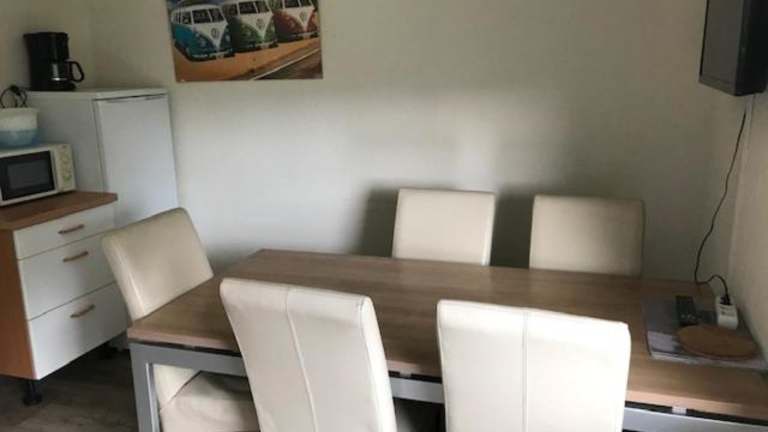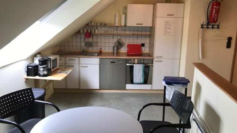 Die Zimmer sind mit einer Küchenzeile ausgestattet, die über einen Kühlschrank und einen Ofen verfügt.