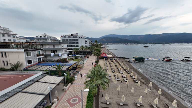 Das Hotel befindet sich in zentraler Lage in Marmaris, nur 20 Meter vom Sandstrand entfernt. Sonnenschirme und Liegen stehen am Strand zur Verfügung.