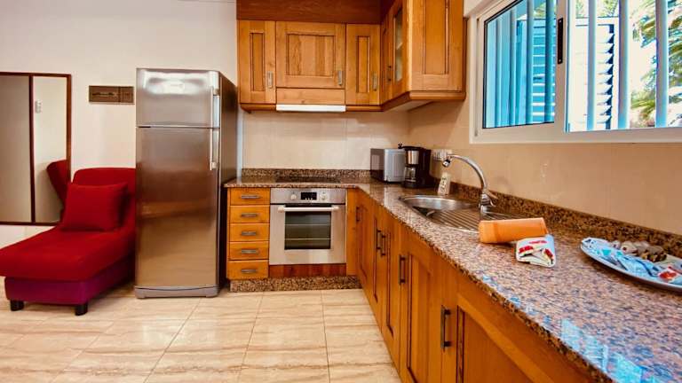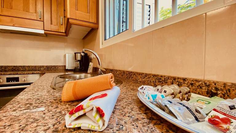 Die voll ausgestattete Küche beinhaltet einen Kühlschrank und eine Kaffeemaschine, was die Zubereitung von eigenen Mahlzeiten ermöglicht. Keine weiteren Verpflegungsmöglichkeiten sind angegeben.