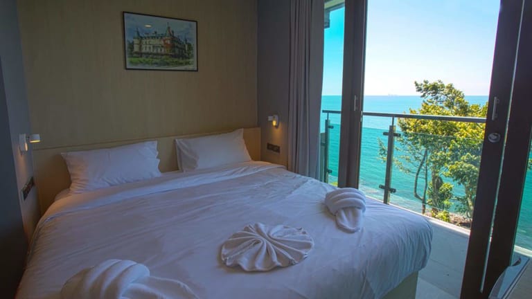 Die klimatisierten Zimmer sind ausgestattet mit einem Kleiderschrank, Wasserkocher, Kühlschrank, Safe, Flachbild-TV, Balkon und eigenem Badezimmer mit Dusche. Die Zimmer bieten auch einen Sitzbereich.